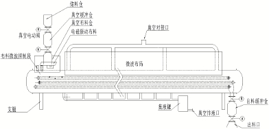 為物料的連續進出,采用雙級真空擋板閥裝置。該裝置由進料鬥、緩衝倉、上真空擋板閥、暫存倉、下真空擋板閥、接口等部分組成。同時,在進料端輔以電磁布料裝置,使物料均勻分布於傳送帶上。其動作過程為,初始狀態上、下真空擋板閥均閉合,物料經進料鬥進入緩衝倉,達到一定質量後,上真空擋板閥首先打開,物料進入緩衝倉,然後上真空擋板閥關閉,下真空擋板閥打開,物料經接口進入設備內部,下真空擋板閥關閉,完成一動作循環,準備進入下一循環。輔助的布料裝置,了間隙時間內,物料的連續性。真空擋板閥采用電動控製,同時擋板上嵌有食品級矽橡膠密封材料用以真空密封,接口處有導電材料密封成人看片免费。